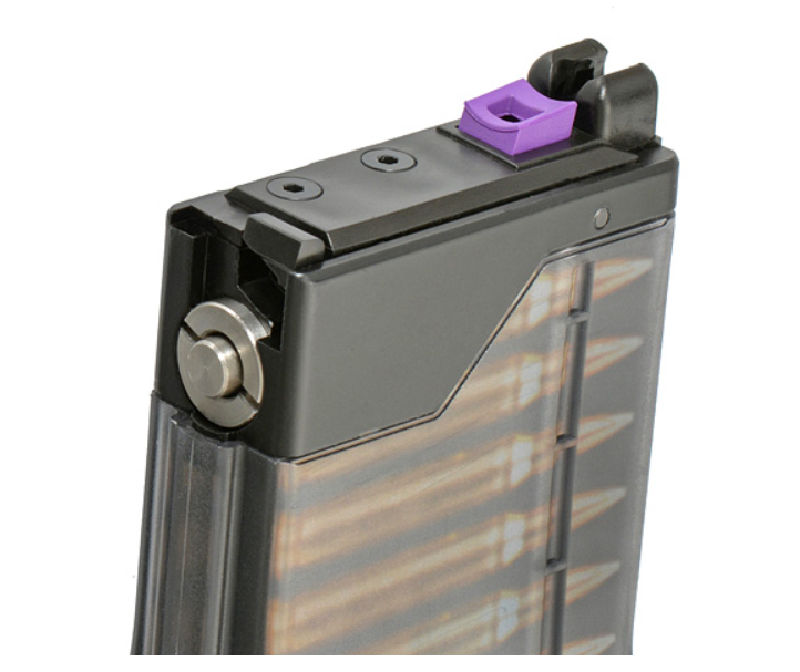 Valva de gaz este discret integrată în talpa încărcătorului, menținând aspectul realist al designului tip STANAG modernizat.