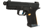 - Lightweight, rugged injection molded polymer frame, with interchangeable backstraps and „stippled” texture for positive grip surface, designed off of the original SAI specifications for optimized ergonomics • CNC Machined steel slide with lightening cuts, aggressive slide serrations & SAI rollmarks • Fiber optic front sight and SAI rear sight, designed specifically for single handed manipulation (compatible with all TM spec sights) • SAI brass color removable backstrap and magazine release for added weight to enhance balance while shooting • Frame integrated 20mm accessory rail is ideal for mounting weapon lights and other accessories • Beveled magazine well for improved reloads • Threaded, fluted SAI style outer barrel • Unique individualized serial number laser-engraved on every model
